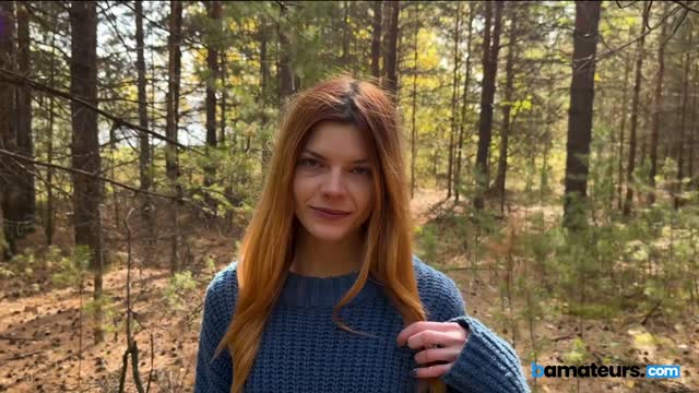 Ginger babe swallows cock in the woods