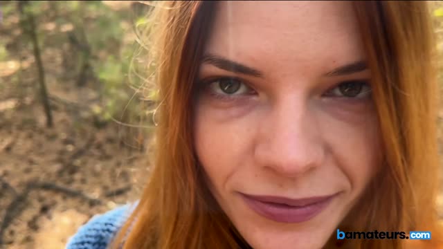 Ginger babe swallows cock in the woods